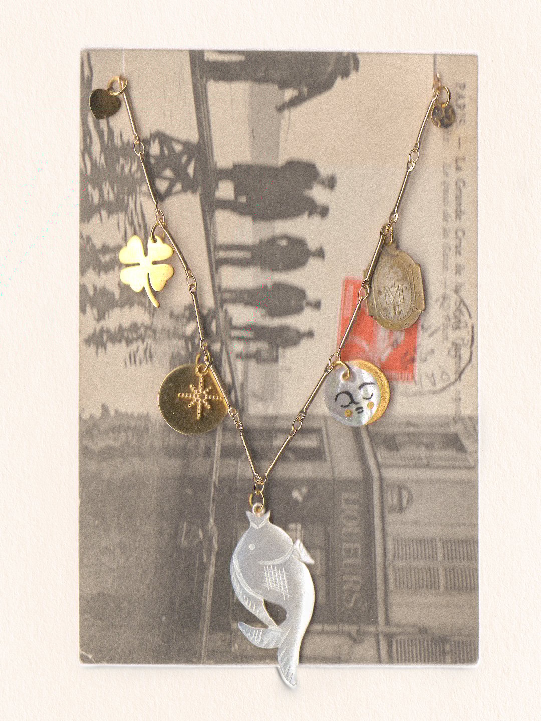 Le collier est présenté sur une carte postale vintage — elle aussi chinée — et glissé dans une pochette en papier glacé tamponnée et numérotée.