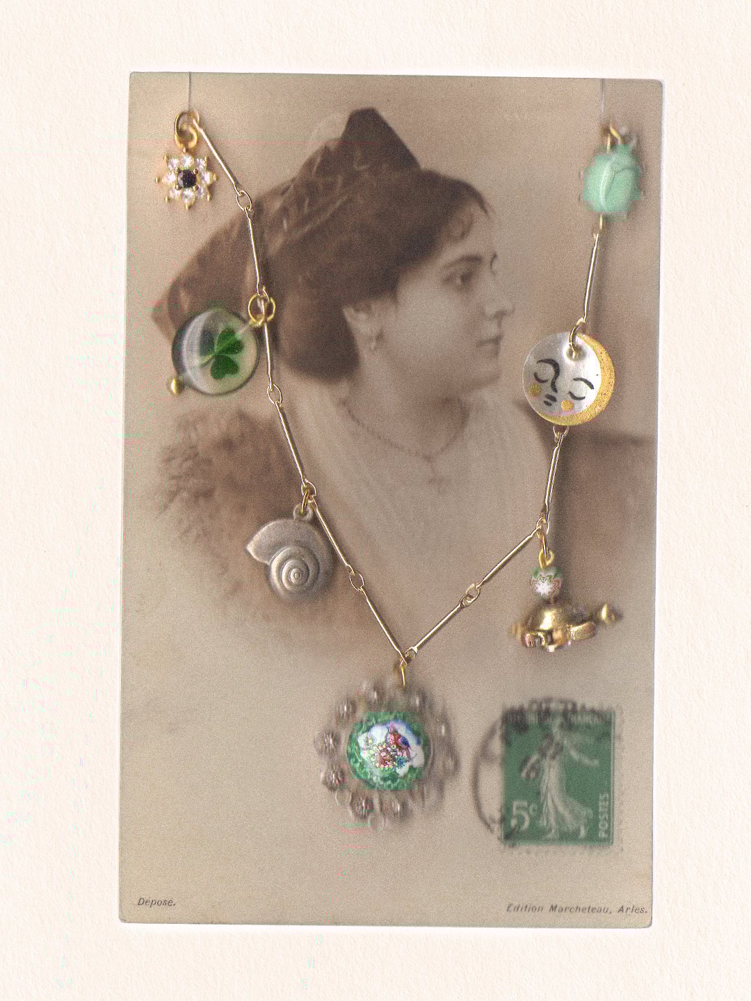Le collier est présenté sur une carte postale vintage — elle aussi chinée — et glissé dans une pochette en papier glacé tamponnée et numérotée.