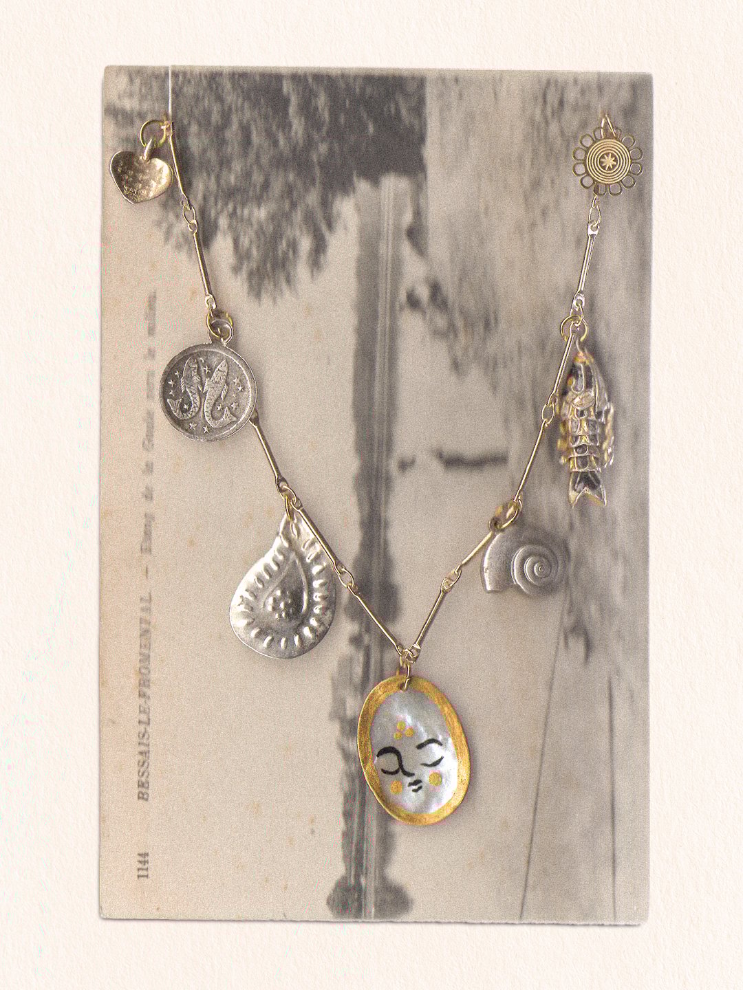 Le collier est présenté sur une carte postale vintage — elle aussi chinée — et glissé dans une pochette en papier glacé tamponnée et numérotée.
