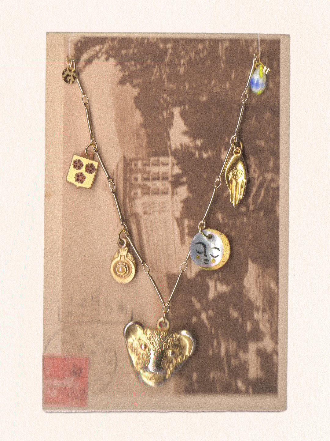 Le collier est présenté sur une carte postale vintage — elle aussi chinée — et glissé dans une pochette en papier glacé tamponnée et numérotée.