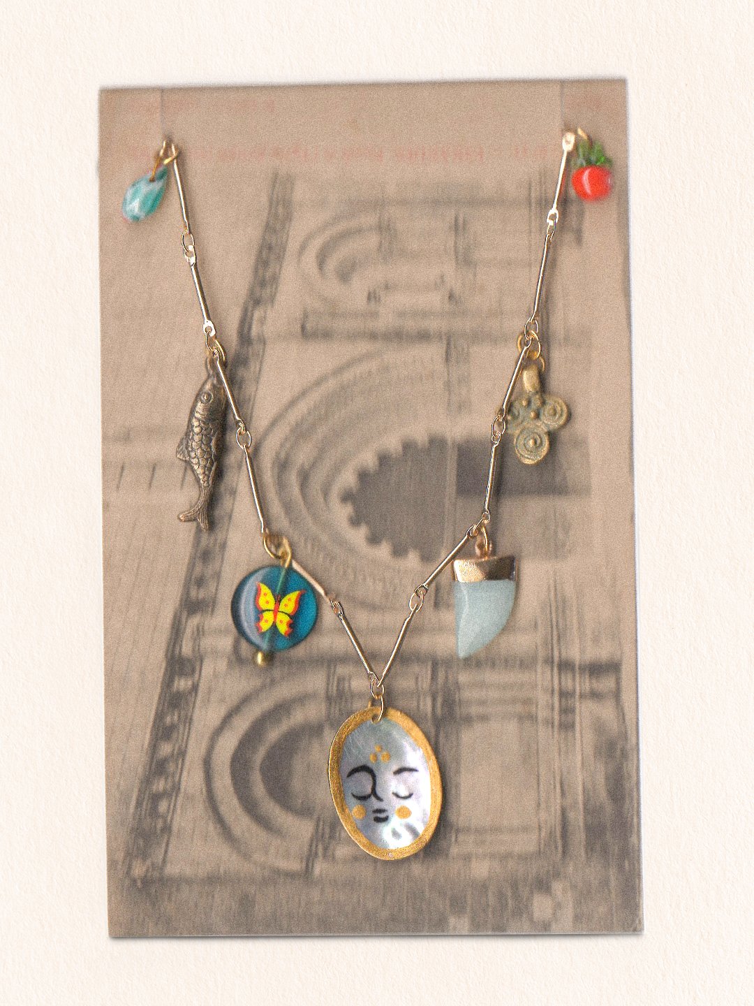 Le collier est présenté sur une carte postale vintage — elle aussi chinée — et glissé dans une pochette en papier glacé tamponnée et numérotée.