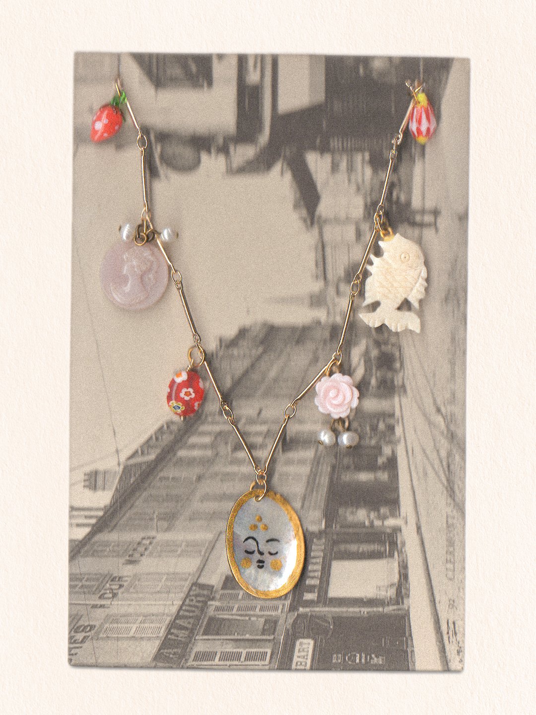 Ce collier est une pièce unique, composée de 7 breloques chargées d’histoires et de symboles que j’ai chinées avec patience et passion dans des brocantes et boutiques remplies de trésors endormis.