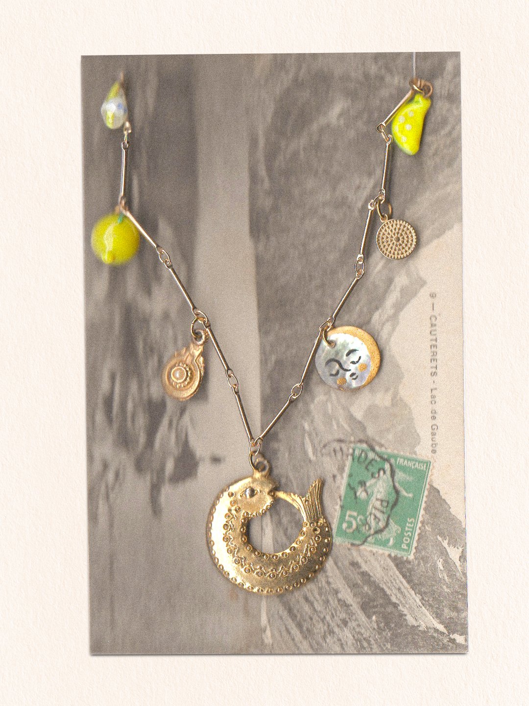 Le collier est présenté sur une carte postale vintage — elle aussi chinée — et glissé dans une pochette en papier glacé tamponnée et numérotée.